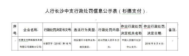 9月4日,杉德支付湖南分公司违反银行卡收单业务相关规定,被央行长沙中心支行罚款5万元。