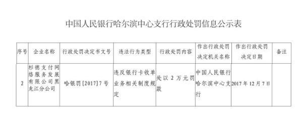 2017年12月7日,杉德支付黑龙江分公司违反银行卡收单业务相关制度规定,被央行哈尔滨中心支行罚款2万元。