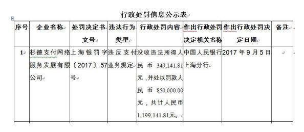 2017年9月5日,杉德支付违反支付业务规定,被上海分行没收违法所得人民币34.91万元,并处以罚款人民币85万元,共计人民币119.91万元。