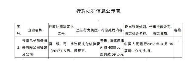 2017年3月15日,杉德电子商务服务有限公司福建分公司违反支付结算管理规定,被福州中心支行警告,并没收违法所得4000元,处罚款59万元。