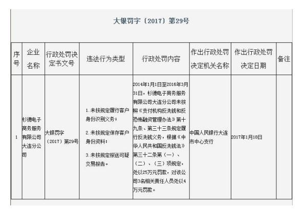 行政处罚决定书显示,2014年1月1日至2016年3月31日,杉德电子商务服务有限公司大连分公司未按照“支付机构反洗钱和反恐怖融资管理办法”第十九条,第三十三条规定履行反洗钱义务,根据“中华人民共和国反洗钱法”第三十二条第(一),(二),(三)项规定,处以25万元罚款,对该公司3名相关责任人员处以4万元罚款。