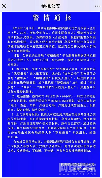 10月19日,余杭公安发布通报,称在2018年10月19日,浙江草根网络科技有限公司(下称“草根投资”)法定代表人金忠栲(男,39岁,浙江金华市人,公司实际负责人)到杭州市公安局余杭区分局投案。现根据前期群众报案和金忠栲供述,公安机关经初查后对草根投资涉嫌非法吸收公众存款案立案侦查,依法对金忠栲及相关人员取刑事强制措施。