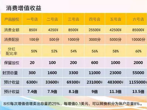 (二)静态收益模式。1、投850元可七次分红派息,增值7.4倍,约赚6300元。2、投4250元可七次派息分红,增值7.9倍,约赚33600元。3、投8500元可七次派息分红,增值8.1倍,约赚69300元。4、投25500元可七次派息分红,增值9倍,约赚231000元。5、投42500元可七次派息分红,增值11.8倍,约赚483000元。6、投85000元可七次派息分红,增值13.5倍,约赚1155000元。