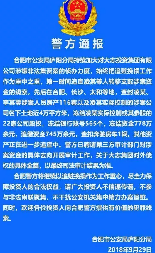 合肥市公安局庐阳分局发布了对大志投资集团有限公司涉嫌非法集资案的案情进展通报。通报显示,庐阳警方持续进行追赃挽损工作,追查大志投资集团有限公司涉嫌非法集资案犯罪嫌疑人凌某等人转移支配涉案资金的线索,先后在合肥、长沙、太和等地,查封嫌疑人凌某、李某等涉案人员房产116套以及凌某实际控制的涉案公司名下土地近4万平方米,冻结凌某实际控制或其参股的22家公司股权,冻结银行账号565个,冻结资金778万余元,追缴资金745万余元,查扣奔驰房车1辆。