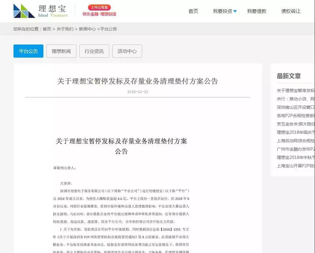 10月22日,P2P平台理想宝发布《关于理想宝暂停发标及存量业务清理垫付方案公告》称,理想宝在保持网站各项功能正常运营情况下,将暂停目前业务,停止大额标的业务发标,直到清理完不合规大额业务,力争备案。