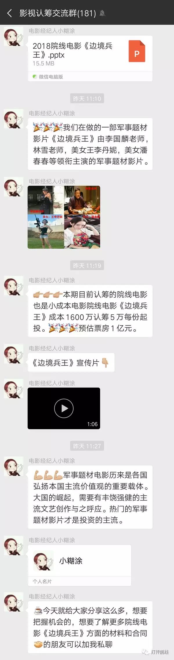 记者通过微信好友推荐加入了一个“影视认筹交流群”,群主的网名为“电影经纪人小糊涂”。该群主通过微信群向社会公众宣传“《边境兵王》成本1600万元,认筹5万元每份起投,预估票房1亿元。”并发给记者《边境兵王认购协议》、投资人的转账记录等信息,吸引记者投资。