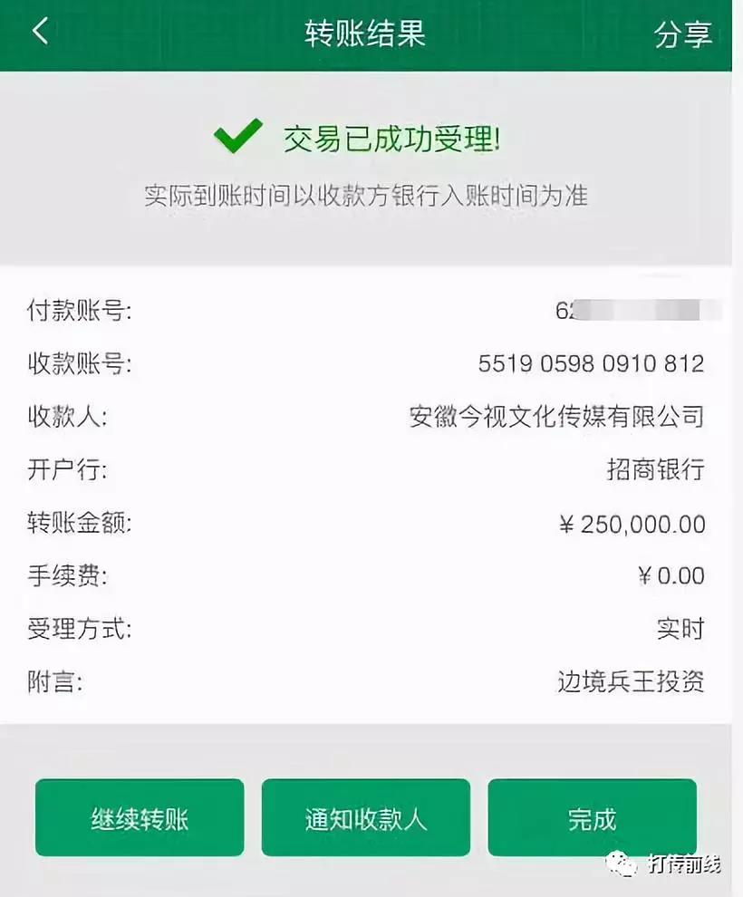 记者在“影视认筹交流群”里看到投资人通微信、支付宝及银行等方式的转账记录显示收款方为安徽今视文化传媒有限公司。