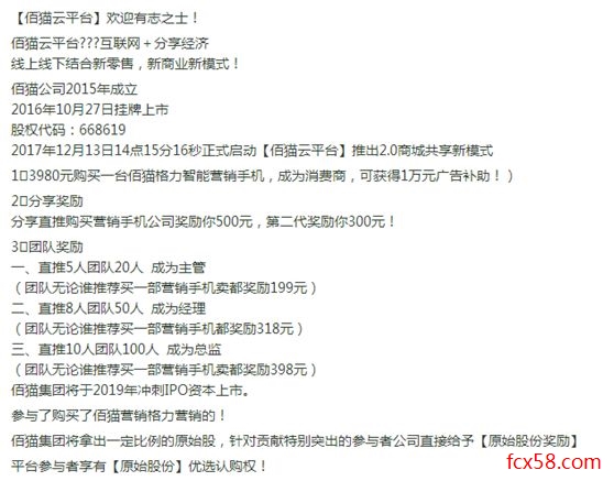 佰猫云的模式如下,通过购买手机成为“消费商”,属于变相缴纳会费,按照推广人数分等级,并且以下线业绩为依据来计算上级报酬。