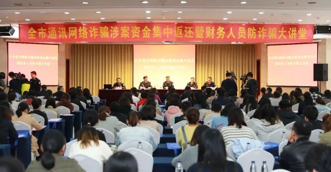 为积极推进打防通讯网络诈骗工作,进一步提高我市公安机关打防违法犯罪和服务人民群众的能力,有力提升群众安全感、获得感和满意度。2018年10月23日上午,杭州市公安局反欺诈中心组织开展全市通讯网络诈骗案件被骗资金集中返还暨财务人员防诈骗大讲堂活动。