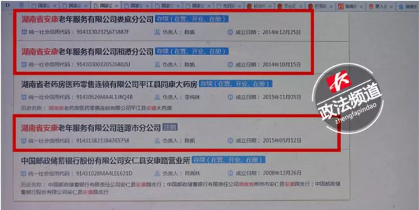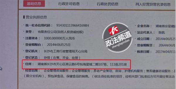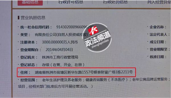 特攻记者通过查询国家企业信用信息公示系统得知,湖南省安康老年服务有限公司的注册地址在株洲市荷塘区,且在长沙并未设立分公司。