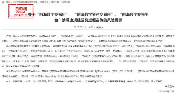 早在2017年5月,深圳市金融办网站就公开提示称,“我办未批准前海数交平台开展有关交易业务”,“该平台主要从事虚拟数字货币交易等业务”,“该公司未经批准在深开展有关业务,可能涉嫌网络虚假宣传”。同时,深圳市金融办在公告中郑重提醒广大市民,切实增强识别、防范、抵制各类非法金融行为的能力。务必牢记,投资有风险、风险须自担。