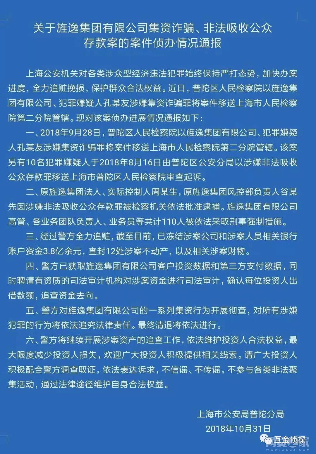 10月31日,上海市公安局普陀分局发布关于旌逸集团案件侦办的最新通报,犯罪嫌疑人孔祥友被移送上海市人民检察院第二分院管辖。原实控人周海生,风控部负责人谷华先被检察机关依法批准逮捕。另有10名犯罪嫌疑人被检察院审查起诉。