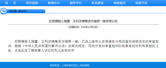 日前,上海市浦东新区人民检察院官网发布了犯罪嫌疑人陶蕾、王利涉嫌集资诈骗罪一案受理公告。