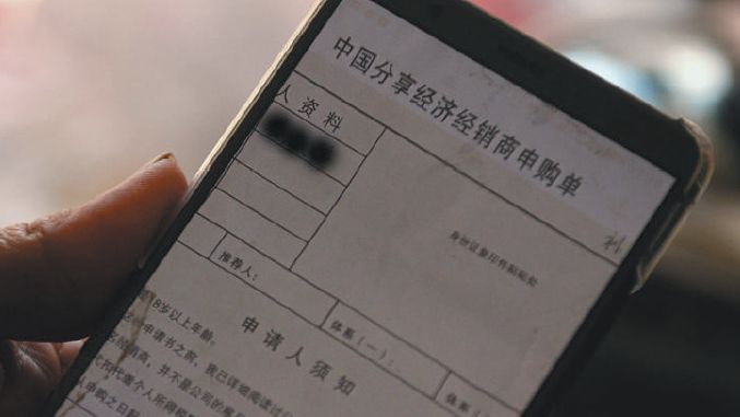10 月27 日,一名被骗进传销组织的女士,向记者展示向传销组织交钱时签订的“中国分享经济经销商申购单”照片。图片来自新京报