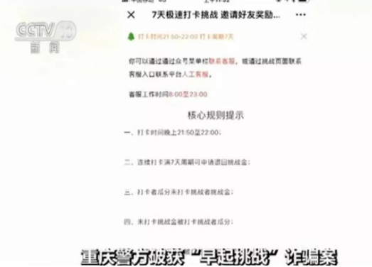 今年6月,重庆警方接到多名群众报警称,一个名叫“早起挑战团”的公众号涉嫌诈骗。该公众号宣称,参与者支付每份10元至5000元不等的保证金,在规定时段内登录指定公众号或APP打卡报到,打卡人可以平分未打卡人的保证金。