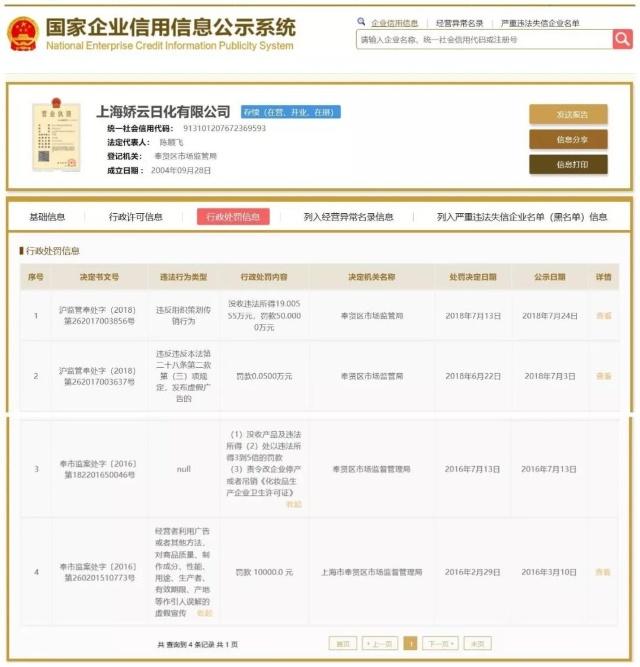 国家企业信用信息公示系统显示,当事人于2016年2月、2018年6月因虚假宣传、发布虚假广告被处罚,还于2016年7月因产品质量存在问题被责令停产。