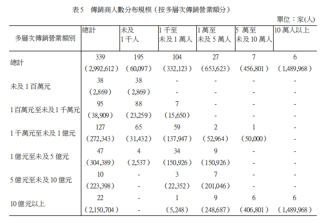 多层次传销事业营业额10亿元以上者有22家(2016年20家),占总事业家数之6.49%,其营业总额达651.47亿元,占全体传销事业年营业总额之73.51%(2016年72.09%),平均每家营业额29.61亿元,较2016年平均每家营业额31.76亿元,减少2.15亿元。