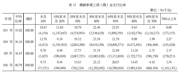 2017年多层次传销事业佣(奖)金支出计361.44亿元,占营业总额40.79%,较2016年佣(奖)金支付比率38.87%,增加1.92个百分点。其中,佣(奖)金支出占各事业之营业总额30%至未及40%之事业最多,计75家(占22.12%);其次为40%至未及50%之事业,计70家(占20.65%);第三为20%至未及30%之事业,计53家(占15.63%)。