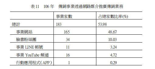 2017年透过网络媒介推广多层次传销业务者183家(占总家数53.98%),其中以透过事业网站方式营销居首(165家,占总家数48.67%),次为透过脸书粉丝团(34家,占总家数10.03%)。另运用「直播」进行多层次传销推广之家数有46家(占总家数13.57%),显示近年传销事业使用网络推广者日益普及。