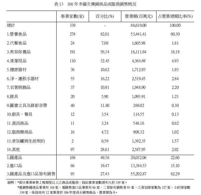 2017年传销事业销售之传销商品仍以营养食品销售额最大,计534.41亿元(占60.30%),其次为美容保养品161.12亿元(占18.18%),第三为清洁用品43.65亿元(占4.93%),第四为其他商品(如:精油、开运商品、一般食品等)25.88亿元(占2.92%),四者计占营业总额86.33%。倘以传销事业销售之国产品及进口品销售额观察,以国产品及进口品皆有销售者为主,其营业额为552.03亿元(占营业总额62.29%);次为仅销售国产品者,其营业额为200.32亿元(占营业总额22.60%);末为仅销售进口品者,其营业额计133.85亿元(占营业总额15.10%)。