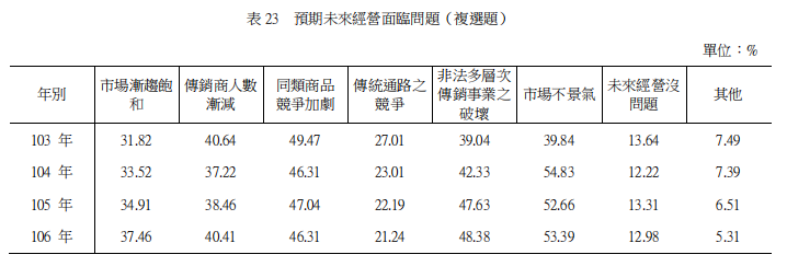 多层次传销事业对于未来经营可能面临之问题,以担忧市场不景气居首(占总家数53.39%),其次为非法多层次传销事业之破坏(占总家数48.38%),排序第三至五名分别为同类商品之竞争加剧(占总家数46.31%)、传销商人数渐减(占总家数40.41%)及市场渐趋饱和(占总家数37.46%),其中非法多层次传销事业之破坏自2014年起百分比逐年增加,显示传销事业认为非法多层次传销事业之破坏对其经营具相当程度之影响。