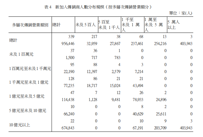 2017年新加入之传销商共计95.64万人,占传销商总人数(299.26万人)31.96%,较2016年之新加入传销商100.35万人,减少4.71万人。