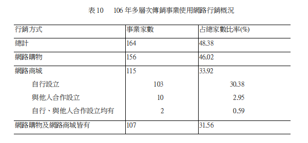 2017年采行网络营销之多层次传销事业共164家,占整体家数48.38%。其中,传销事业提供在线订购(网络购物)者,有156家(占总家数46.02%),传销事业设置网络商城供传销商购买之事业有115家(占总家数33.92%),另外,传销事业网络购物及网络商城皆有设置者,有107家(占总家数31.56%)。