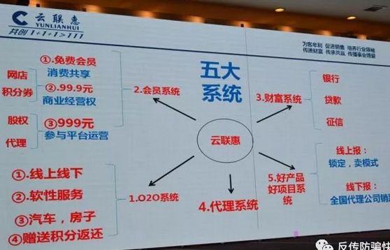 警方介绍,广州“云联惠”传销组织打着“气死马云、踢走京东”“你消费、我买单”“消费共享、消费全返”等口号,进行线上线下宣传,以设置云联商城交易平台为幌子,虚假对外宣传消费多少、返还多少。消费者通过免费注册即成为普通消费会员,会员只要在平台上消费,就可获得消费金额的等额白积分,白积分每日以万分之八的比例转化为红积分,红积分可在平台上二次消费或者转化为人民币提现。