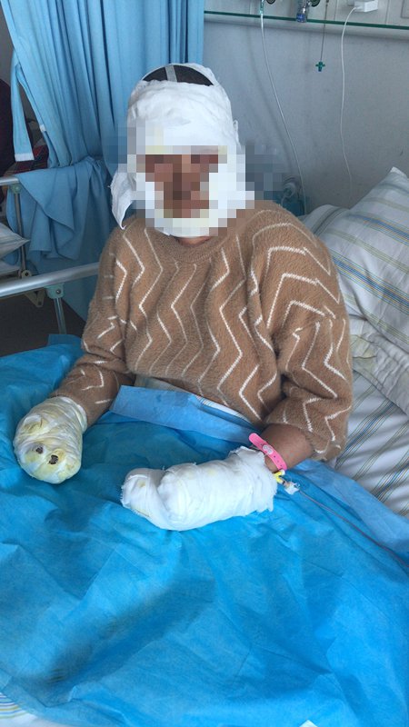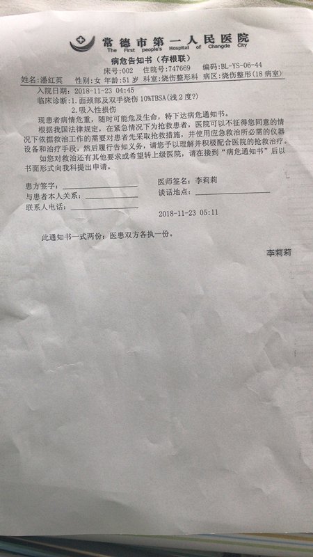 当晚,丈夫发现情况后,立马喊醒了熟睡的潘女士。在灭火过程中,因为火势过大,潘女士的脸和手脚都被烧伤。被送入常德市第一人民医院后,医生判定两级烧伤,需住院10 余日。加上家里的装修,女儿周小姐说,将损失2-3 万元。