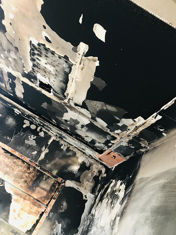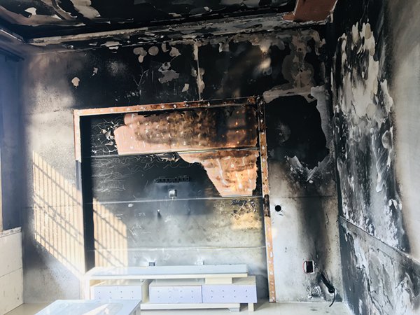 凌晨两点,睡在楼上的丈夫起床,突然听见楼下传来砰砰声,以为有人在敲门,下楼一看,发现夜里火光一片,沙发已被烧没,流火正沿着墙壁,往旁边的空调和电视机蔓延。而刚刚的声音,是墙上的瓷砖在爆炸。