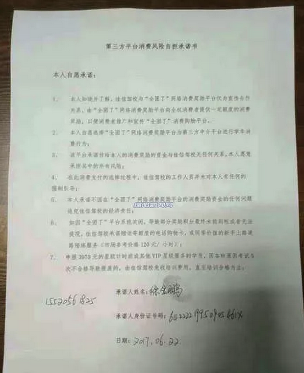 因为有了“云联惠”的“前车之鉴”,佳信驾校这次和“全团了”搞“合作宣传”招生时,特地和每一位学员签了一份《第三方平台消费风险自担承诺书》。