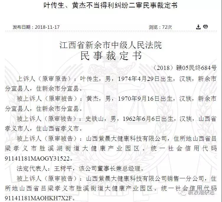 11月16日,江西省新余市中级人民法院公布《叶传生、黄杰不当得利纠纷二审民事裁定书》,上诉人叶传生因与被上诉人黄杰、史铁山、山西紫晨大健康科技有限公司(以下简称紫晨科技公司)、山西紫晨大健康科技有限公司销售一分公司(以下简称紫晨科技销售公司)、紫晨农业股份有限公司(以下简称紫晨农业公司)不当得利纠纷一案,不服江西省新余市分宜县人民法院(2018)赣0521民初906号民事裁定,故提起上诉。