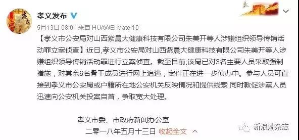 2018年5月13日,孝义市政府新闻办公室官方微博@孝义发布披露消息称,近日孝义市公安局对山西紫晨大健康科技有限公司朱美开等人涉嫌组织领导传销活动罪进行立案侦查,截至目前,该局已对3名主要人员采取强制措施,对其余6名骨干成员进行网上追逃,案件正在进一步侦办中。