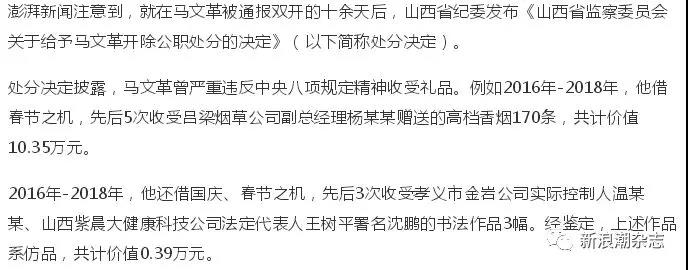 值得一提的是,今年8月15日,孝义市委原书记马文革被通报“双开”。在《关于给予马文革开除公职处分的决定》中提到,马文革借国庆、春节之机,先后3次收受孝义市金岩公司实际控制人温某某、山西紫晨大健康科技公司法定代表人王树平署名沈鹏的书法作品3幅。经鉴定,上述作品系仿品,共计价值0.39万元。