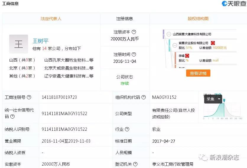 据其工商注册信息显示,山西紫晨大健康于2016年11月正式注册,公司股东分别为紫晨农业(占股51%)和史铁山(占股49%),而紫晨农业只是公司法人代表、董事长旗下所谓庞大的“紫晨系”中一个子公司,而史铁山则来自于孝义当地煤焦企业山西金岩集团。