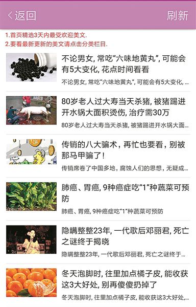排行榜中的文章多图文并茂,比较简短,阅读时间约为三到五分钟,以养生类文章居多,其中,许多有广告内容。记者对截至12月1日下午4时的阅读排行榜前100名的文章做了一个分类统计:养生保健类27篇,新闻类27篇,揭秘类18篇,育儿家居类14篇,名人轶事类9篇,其他5篇。其中,健康类板块的广告植入最多,多篇文章植入了某牌消炎止痛贴和某牌医用冷敷贴的广告,但记者在国家食品药品监督管理总局的官网上未查询到其审批号。此外,多种养生产品的广告植入也很多。