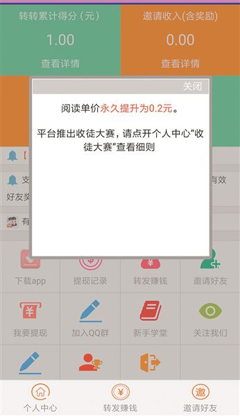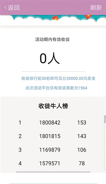 此外,该平台还设置发展下线(徒弟)奖励:成功邀请一个好友成为有效用户奖励7元,徒弟转发收入达1元后奖励师傅1元,徒弟前三次提现分别奖励师傅2元;还可享直接邀请的好友(一级徒弟)20%收益的奖励,享受二级徒弟10%收益的奖励。平台还特地开办了收徒大赛,收徒牛人榜前30名发展的下线人数从22到153不等,他们能瓜分2万元奖金。