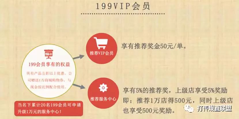 奖励:(1)直推1个199会员,奖励50元(只有一级奖励)。(2)直推1个店主,奖励500元。(3)所有直推的199会员每次重复消费的3%奖励给您,长期有效。