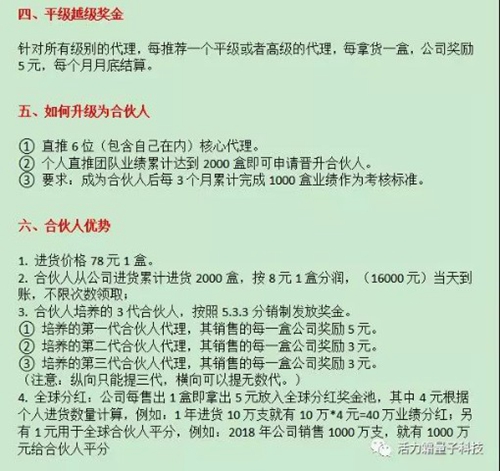 按照这样的说法,合伙人(批发商)晋升:两个月内直推5位核心代理,个人业绩累计达到2000支,即可申请晋升合伙人。要求:成为合伙人后每三个月累计完成1000支业绩作为考核标准。合伙人利益:1)全国最低价78元;团队进货价每支奖励8元;享受533佣金;运作三级代理;享受全球每支5元分红。