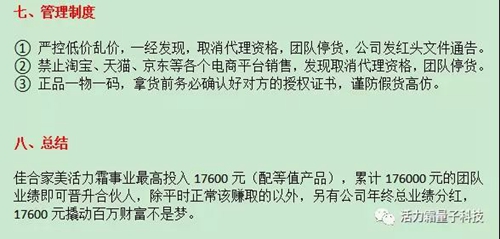 代理商告诉本网:“为了规避法律风险,合伙人奖金纵向只提三代,横向可提无数代。” 带着疑问,本网咨询了相关律师,律师表示:“根据国务院颁布的《禁止传销条例》第七条规定,下列行为,属于传销行为:1、组织者或者经营者通过发展人员,要求被发展人员发展其他人员加入,对发展的人员以其直接或者间接滚动发展的人员数量为依据计算和给付报酬(包括物质奖励和其他经济利益,下同),牟取非法利益的;2、组织者或者经营者通过发展人员,要求被发展人员交纳费用或者以认购商品等方式变相交纳费用,取得加入或者发展其他人员加入的资格,牟取非法利益的;3、组织者或者经营者通过发展人员,要求被发展人员发展其他人员加入,形成上下线关系,并以下线的销售业绩为依据计算和给付上线报酬,牟取非法利益的。显然,佳合家美设计的奖金制度与法规规定相冲突。”
