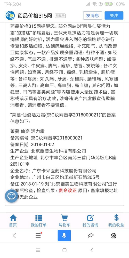本网经查询得知,莱蔓仙姿活力霜在今年1月2日因虚假宣传被责令整改。