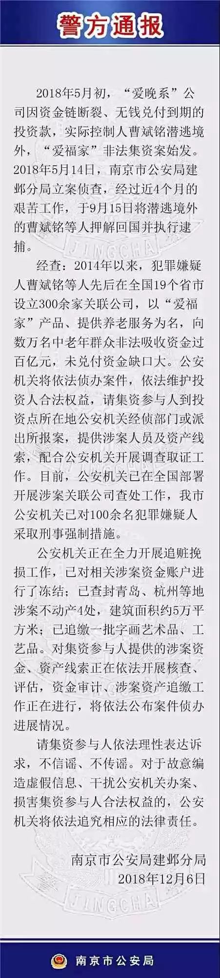 经查:2014 年以来,犯罪嫌疑人曹斌铭等人先后在全国 19 个省市设立 300 余家关联公司,以“爱福家”产品、提供养老服务为名,向数万名中老年群众非法吸收资金过百亿元,未兑付资金缺口大。公安机关将依法侦办案件,依法维护投资人合法权益,请集资参与人到投资点所在地公安机关经侦部门或派出所报案,提供涉案人员及资产线索,配合公安机关开展调查取证工作。