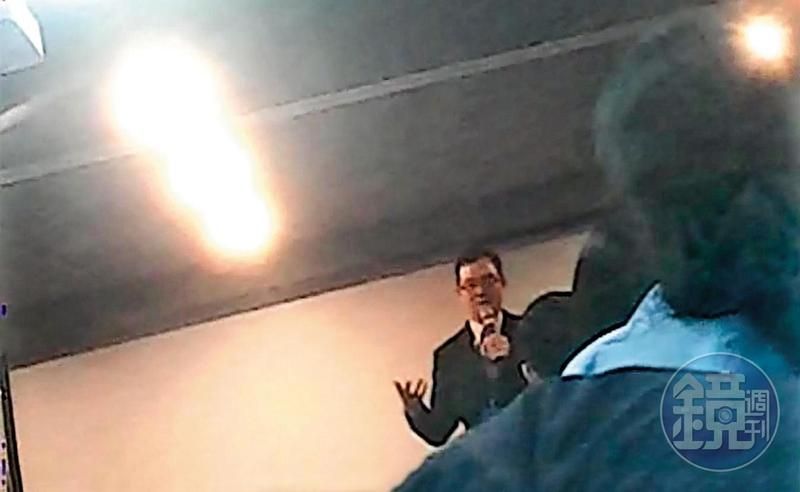 1名身穿西装的中年男子接下麦克风,搭配投影萤幕向台下听众介绍所谓「百年难得一见」的快速致富机会。