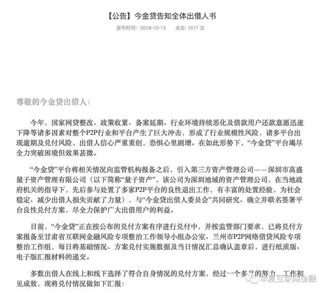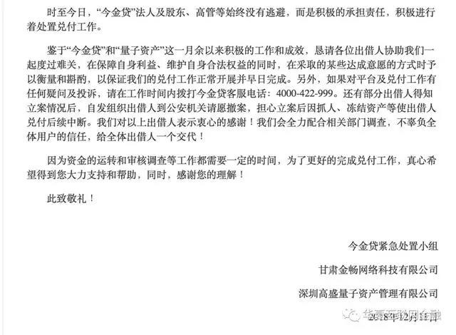 公告称,平台已引入第三方资产管理公司——深圳市高盛量子资产管理有限公司(以下简称“量子资产”)参与退出工作。量子资产已与“今金贷出借人委员会”共同研究、确立并联名签署平台良性兑付方案,尽全力保护广大出借用户的利益。