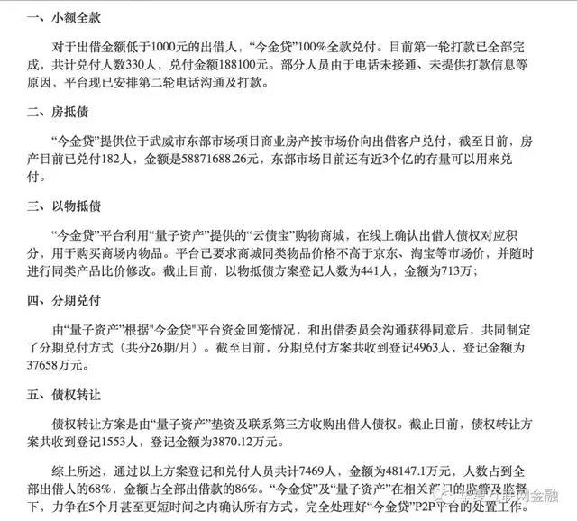综上所述,通过以上方案登记和兑付人员共计7469人,金额为48147.1万元,人数占到全部出借人的68%,金额占全部出借款的86%。“今金贷”及“量子资产”在相关部门的监管及监督下,力争在5个月甚至更短时间之内确认所有方式,完全处理好“今金贷”P2P平台的处置工作。