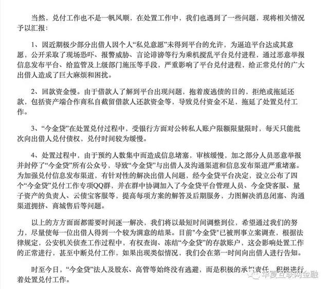 此外,平台承认"今金贷"已被刑事立案调查,根据法律规定,公安机关侦查工作过程中,有权查询、冻结“今金贷”的存款账户,这会影响处置工作的正常进行,甚至中断兑付工作。