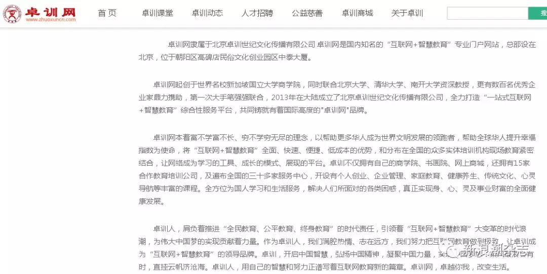 卓训网官网这样介绍:卓训网起创于世界名校新加坡国立大学商学院,同时联合北京大学、清华大学、南开大学资深教授,更有数百名优秀企业家鼎力携助,第一次大手笔强强联合,2013年在大陆成立了北京卓训世纪文化传播有限公司,全力打造“一站式互联网+智慧教育”综合性服务平台,共同铸就有着国际高度的"卓训网"品牌。卓训不仅拥有自己的商学院、书画院、网上商城,还拥有15家合作教育培训公司,及遍布全国的三十多家服务中心,开设有个人创业、企业管理、家庭教育、健康养生、传统文化、心灵导航等丰富的课程。