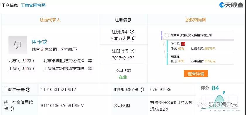 在天眼查新浪潮注意到,北京卓训世纪文化传播有限公司注册时间为2013年8月22日,注册资本为900万人民币。两大股东分别为伊玉龙和高逸峰,前者认缴金额为585万,占股65%,后者认缴315万,占股35%。
