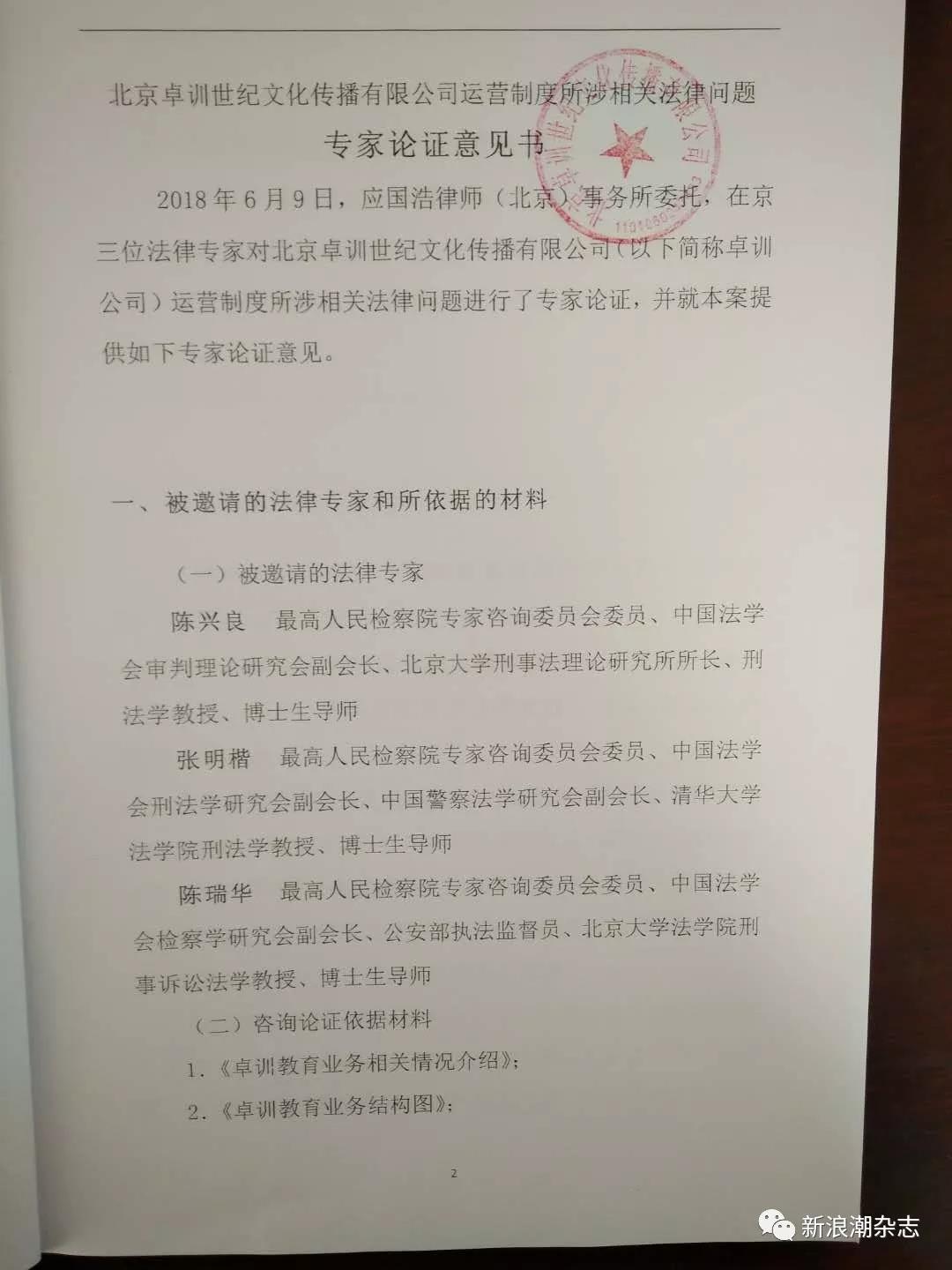 新浪潮从监管部门了解到,对于卓训公司运营制度是否涉传问题,该公司在今年6月份授权国浩律师(北京)事务所,委托三位著名法学家对北京卓训世纪文化传播有限公司运营制度所涉相关法律问题进行了专家论证,三位专家出具了论证意见。