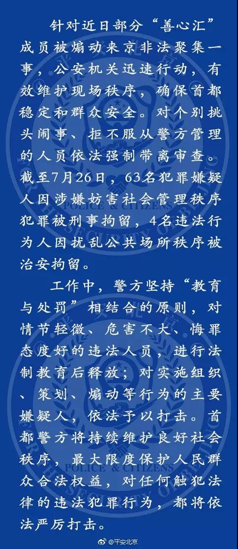 一个月后,善心汇成员又在北京非法聚集。2017年7月24日“平安北京”发布通报称,部分“善心汇”会员被别有用心之人煽动来京非法聚集,严重扰乱了首都社会秩序。